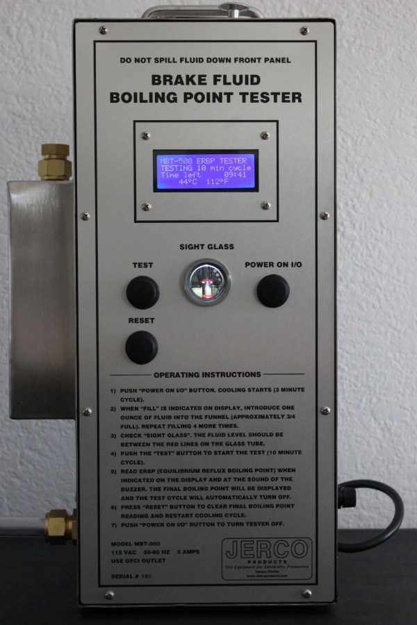 No longer will there be any need to send samples to a laboratory for analysis where tests may be made by questionable methods. With the Jerco Brake Fluid Boiling Point Tester – accurate testing requires less than fifteen minutes!